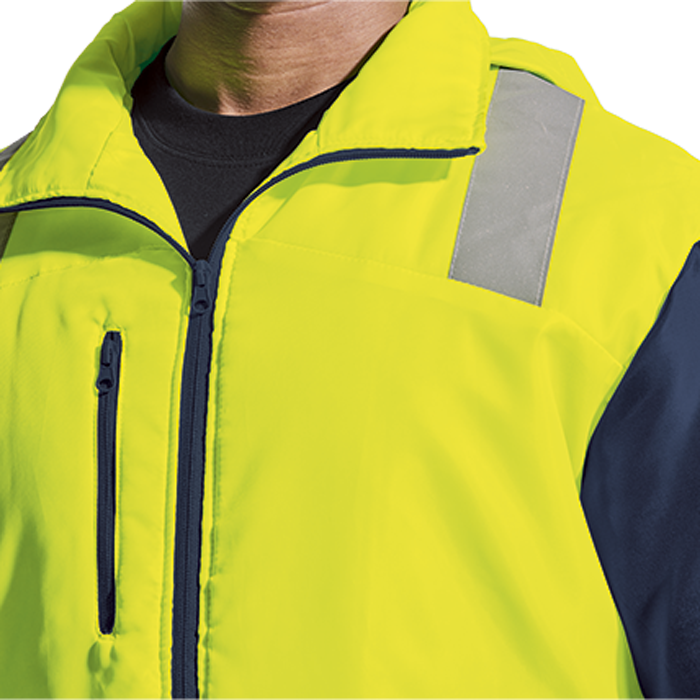 Velcro tab on sleeve hem Front yoke has been angled for ample branding space Front horizontal inseam pockets Front chest pocket with zip closure Fully padded Fully lined Two-tone jacket Perfect for working in winter 100% Coated oxford Po